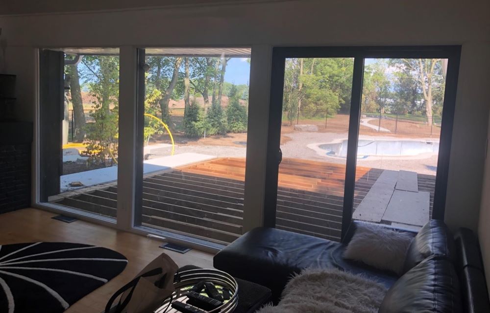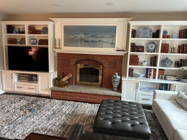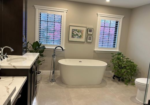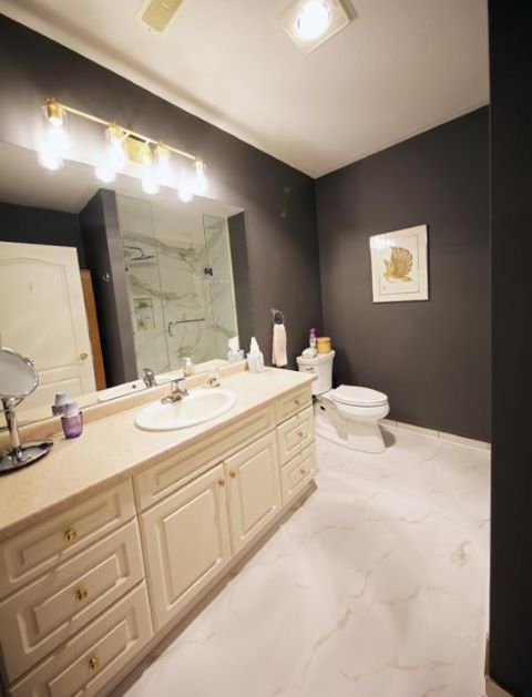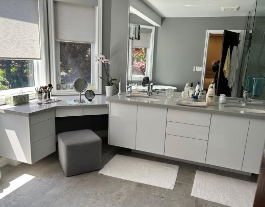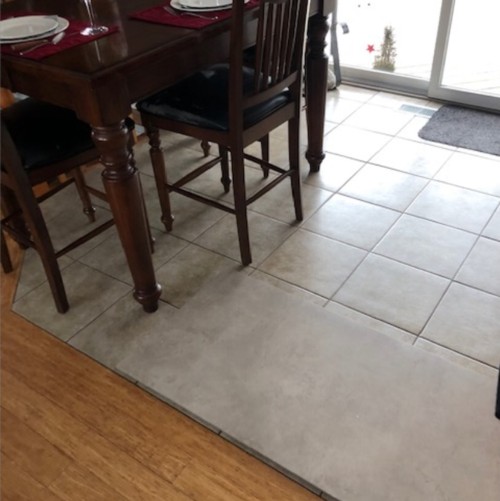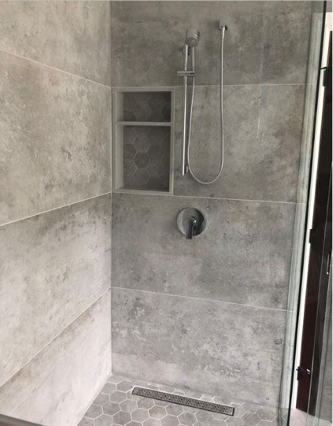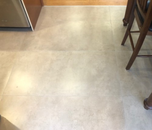 OUT with the old 12 x 12 ceramic tiles and IN with new 24 x 48 porcelain tiles. No more grout to clean ! And we put under floor heating in to keep the toes warm all year long ! |